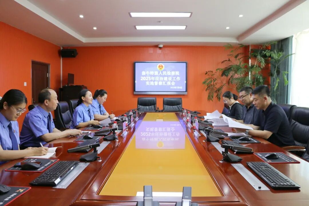 7月8日下午,翁旗政法委副书记海军、司法局副局长赵龙、司法局普法与依法治理股股长朱奥一行,到翁旗检察院实地督导2025年度法治建设工作并召开座谈会。检委会专职委员姜波、第三检察部主任张英利、检察官吕伟光等同志参加。