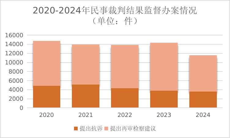 2024年,全国检察机关共受理民事生效裁判监督案件83703件,受理数量基本平稳。2020年至2023年受理数分别为72423件、81974件、69774件、83780件,2024年较2020年上升15.6%,与2023年基本持平。提出监督意见11593件(抗诉3605件、再审检察建议7988件),法院改变12564件(含往期提出监督并于2024年法院结案的案件,其中改判9870件,发回重审397件,和解撤诉1008件,调解1289件),占法院审结生效裁判监督案件数的93%。2024年,最高检依法向最高法院提出抗诉49件、再审检察建议1件,指令下级院提出监督意见3件,有效发挥检察监督在司法理念、政策导向、法律适用等方面引领作用。