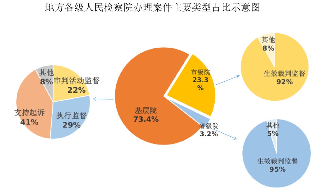 受理的275038件民事检察案件中,基层院受理数占73.4%,市级院占23.3%,省级院占3.2%,最高检243件。其中基层院以民事审判活动监督(44599件)、民事执行活动监督(58975件)、支持起诉(82410件)案件为主,占本级办理案件数的92.1%;市级院及省级院均以生效裁判监督案件为主,分别办理58832件、5320件,占本级办理案件数的91.8%、95.3%。各级民事检察部门形成各有侧重、密切配合、一体履职的民事检察监督格局。