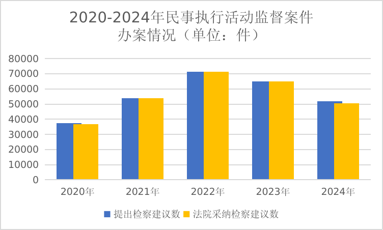 受理民事执行活动监督案件61464件,2020年至2023年受理数分别为49390件、65842件、84125件、77310件,连续三年上升后2023年开始下降,2024年降幅较大(下降12.7%)。提出检察建议51766件,法院采纳率97.8%。