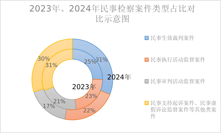 2024年,全国检察机关聚焦法律监督主责主业,依法履行民事检察职责,持续做优民事检察工作。重视民事生效裁判监督,抗诉和再审检察建议更加有力;重视深层次违法监督,民事审判、执行活动监督更加精准;注重坚持支持定位和必要性原则,对特定群体的民事支持起诉更加有效;注重监督惩治虚假诉讼,监督效果进一步显现。